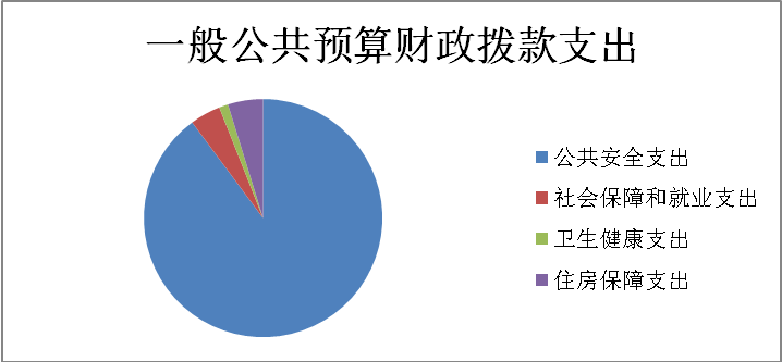 2019年一般公共预算财政拨款支出887.58万元,主要用于以下方面:公共安全支出(类)支出797.57万元,占89.86%;社会保障和就业(类)支出36.79万元,占4.14%;卫生健康支出10.88万元,占1.23%;住房保障支出42.34万元,占4.77%。